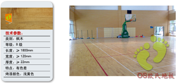 用此品種鋪裝地面,舒適、溫暖、明亮、大方。能完全滿足運動員對體育運動、籃球、羽毛球、網球、排球、乒乓球、壁球、舞臺演出、舞蹈、健身等競技項目的訓練和比賽,體育運動木地板工程的設計在結構上除滿足體育競技和健身需求外,在選用材料上體現了自然環保,在設計上還體現自然、和諧、時尚。體育木地板是一種具有優良的承載性能,高吸震性能,抗變形性能的運動木地板,其表面的摩擦系數達到了0.4-0.6,因太滑或太澀都會對運動員造成傷害。震動吸收性能達到了≥53%可有效的避免運動員受到運動損傷,而作為籃球場的體育木地板,還具有90%以上的球體反彈能力,能有效滿足運動快節奏需求。